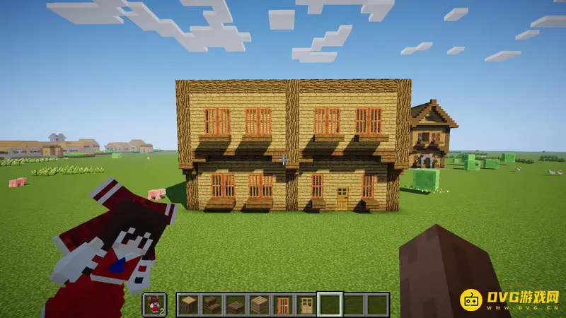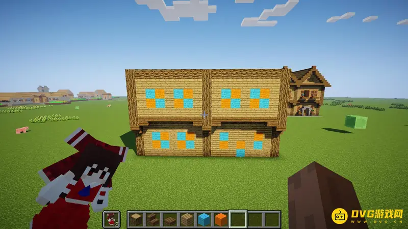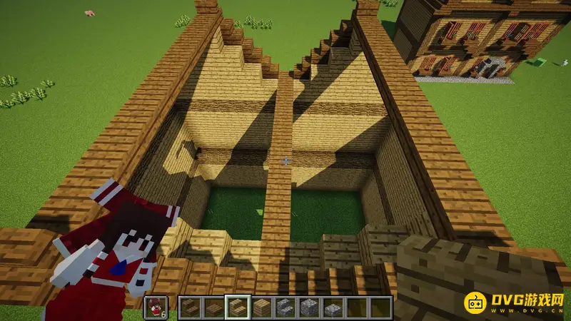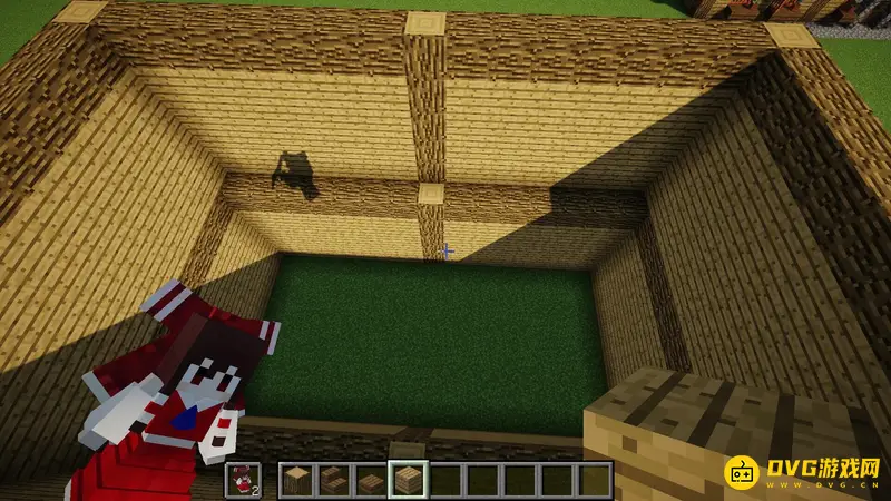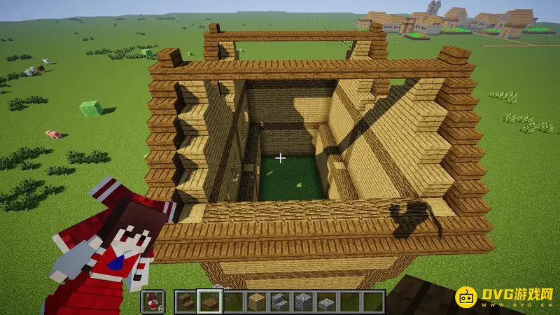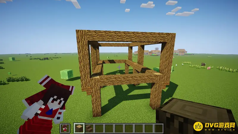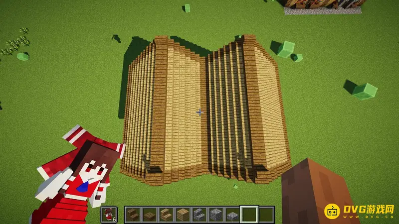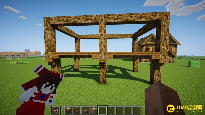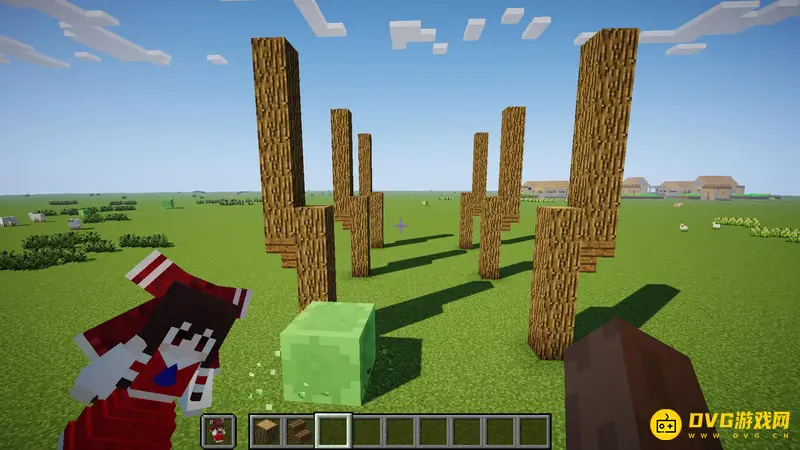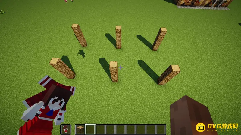 1.首先随便找一块空地,像这样子用橡木原木竖起来6个柱子,每个柱子间隔7格,高5格