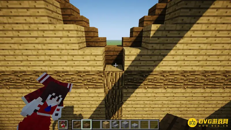 2.如图,在每个柱子第4格高的地方倒置一个云杉楼梯,在上面搭一个6格高的柱子