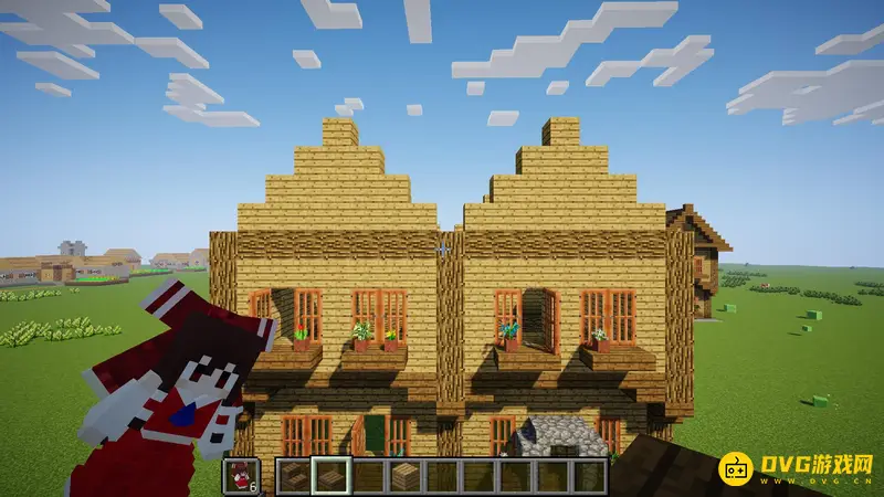 6.回到正面,把标出来的地方打掉,用来搭窗户跟门。用金合欢门当窗户,门是橡木门,每个窗户下面都要用云杉半砖搭一个阳台