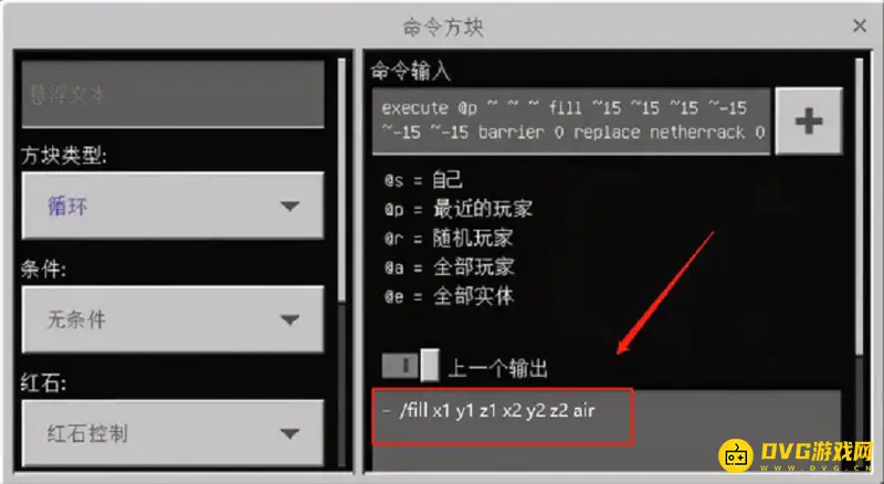 清除所有方块指令是:/fill <区域内方块左上角坐标xyz> <区域内方块右下角坐标xyz>air。或者在图中指令方块打开后输入指令/fill x1 y1 z1 x2 y2 z2 air这个指令中,xyz是对角坐标,数字是要更改的坐标数字,从1坐标到2坐标内的方块就会被清除。