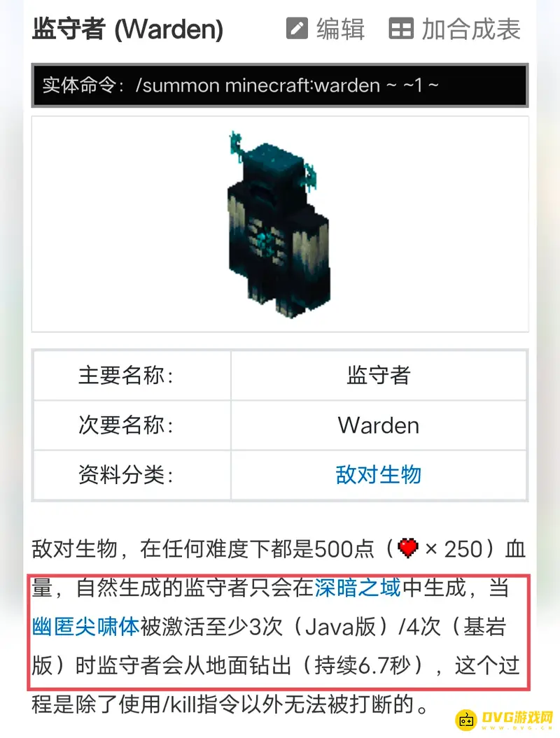 当幽匿尖啸体被激活至少3次(Java版)/4次(基岩版)时监守者会从地面钻出,即可成功召唤。监守者具有击退抗性,免疫火焰伤害,不会主动进入矿车和船。