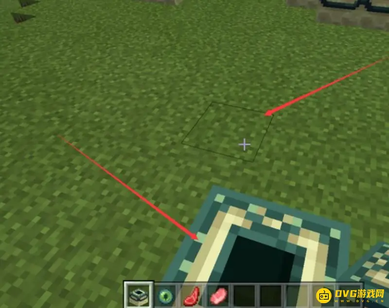 3.然后我们站在垫高的方块上,在方块前一格的位置放置末地传送门方块。箭头指的位置