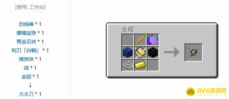 3,接着用烈焰棒,耀魂宝珠,青金石块,利刀「白鞘」,煤炭块,线,金锭合成大太刀。