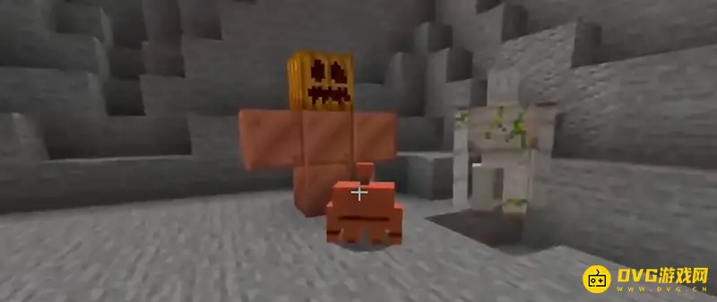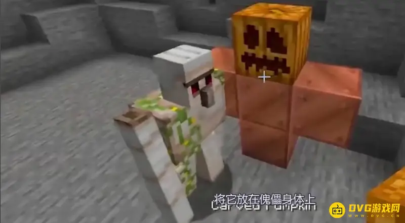 2、搭建好傀儡的身体后,拿出南瓜方块,将它放在傀儡身体上。