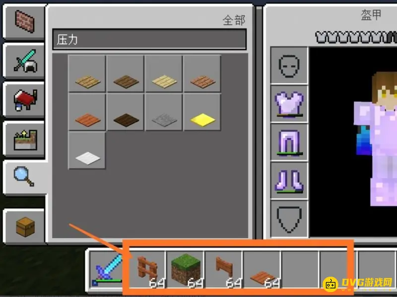 1、首先,为了方便建造养鸡场,我们需要准备一些材料,准备的材料有栅栏,方块,木门和木质压力板,如下图所示。