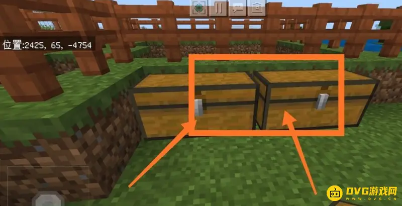 6、两个门放好之后,为了方便收集东西,我们在旁边放着两个大箱子,一个用来放饲料,一个用来放鸡肉,如下图所示。