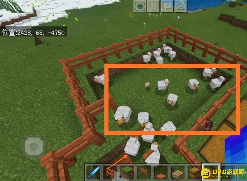 7、最后,我们拿着草种子将我们的小鸡引进我们搭建好的养鸡场即可,这样小鸡就不会飞出来了,如下图所示。