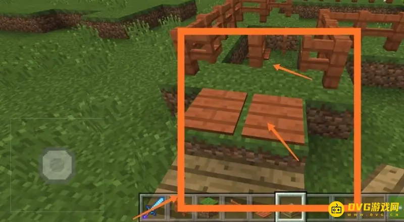 4、将栅栏搭建好之后,我们首先制作第一个门,我们在拐角处放上一个木门,然后放上木质压力板,如下图所示。
