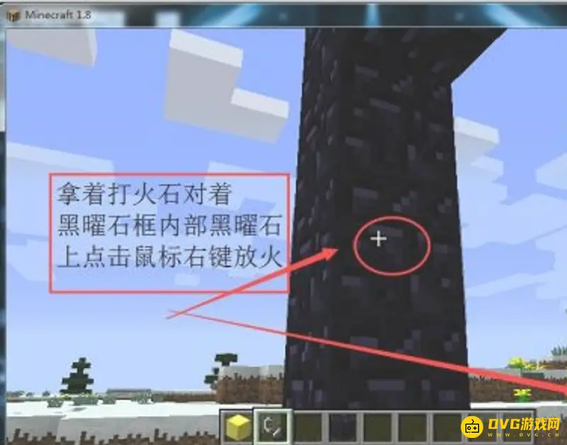 3.使用打火石在黑曜石上放火;把打火石拿在手中,然后十字光标对着黑曜石的内部!点击鼠标右键放火!