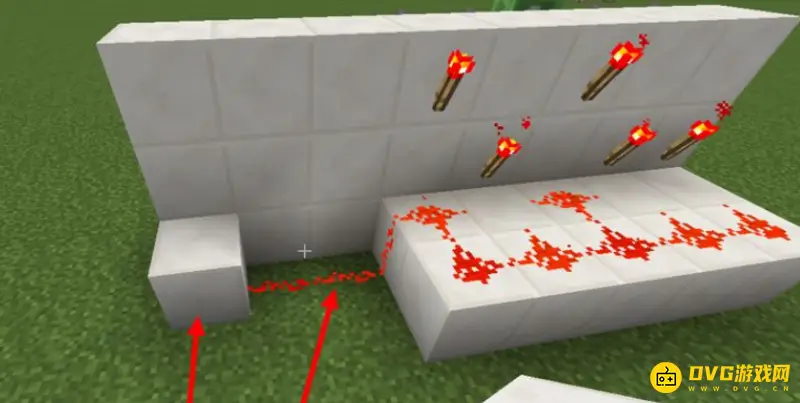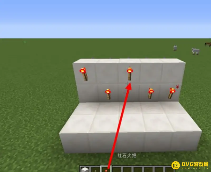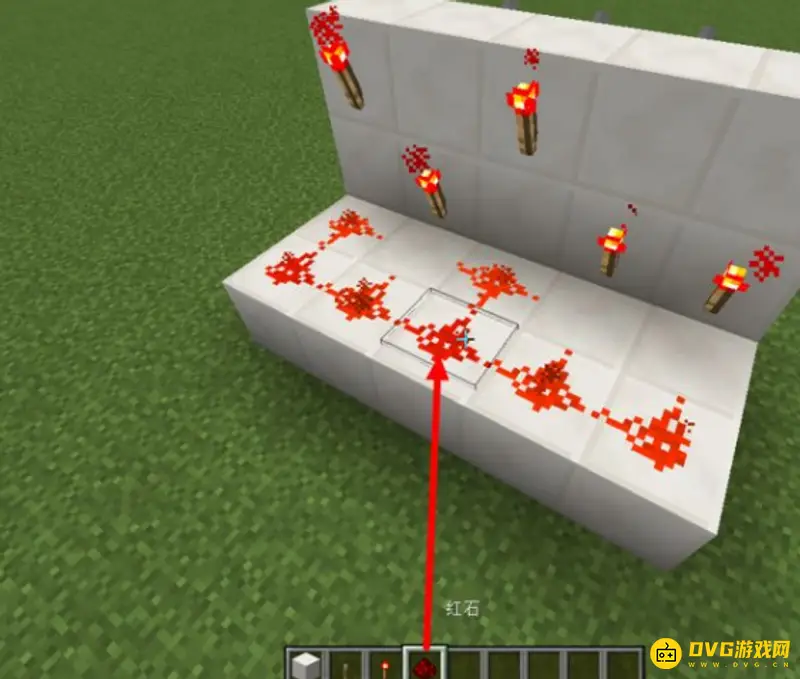 4.然后在这面墙上装上红石火把,顺序可以自由发挥,不需要和本图中一样