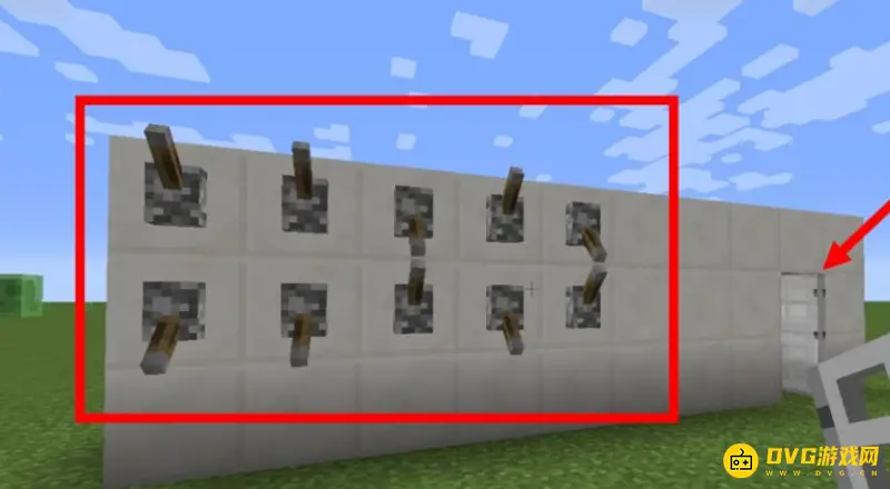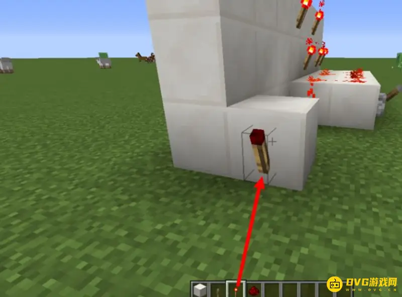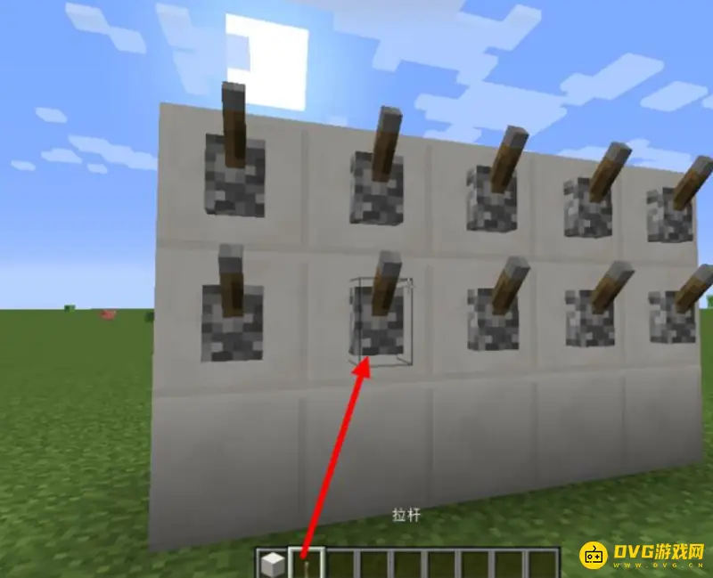7.在平台的前头放上拉杆,在墙头地上的方块上再放一个红石火把