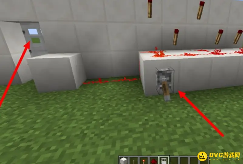 10.进入屋内后,拉动平台前面的拉杆,门口的红石火把就会熄灭,门就自动关上了。这就是带有反锁的密码门