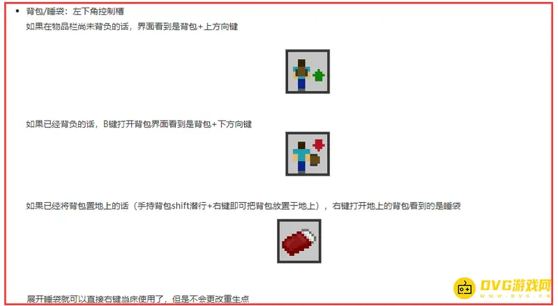 shift 右键。当玩家已经背负旅行者背包,可以看到背面界面是背包 下方向键。此时玩家可以通过shfit(潜行) 右键的功能,把该背包置于地上,打开后即是睡袋。