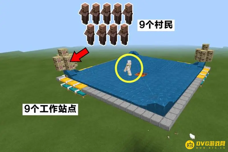 2、在床的位置放上9个工作站点,类型任意,其中以堆肥桶最为节省材料,用工作站点将村民围起来,防止它们被水流冲进岩浆。对角线的位置也如法炮制,这样共计24张床、18个村民,完全满足了铁傀儡的刷新机制。这样就可以刷出铁傀儡了。