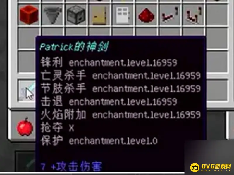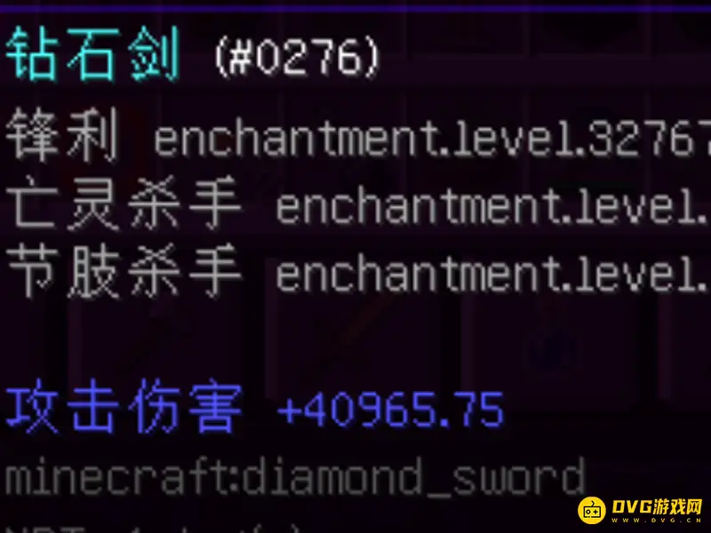 2、指令:/give @p 276 1 0 {ench:[{id:16,lvl:32767},{id:17,lvl:32767},{id:18,lvl:32767}]}。这样刷出来的钻石剑就是如下图所示。