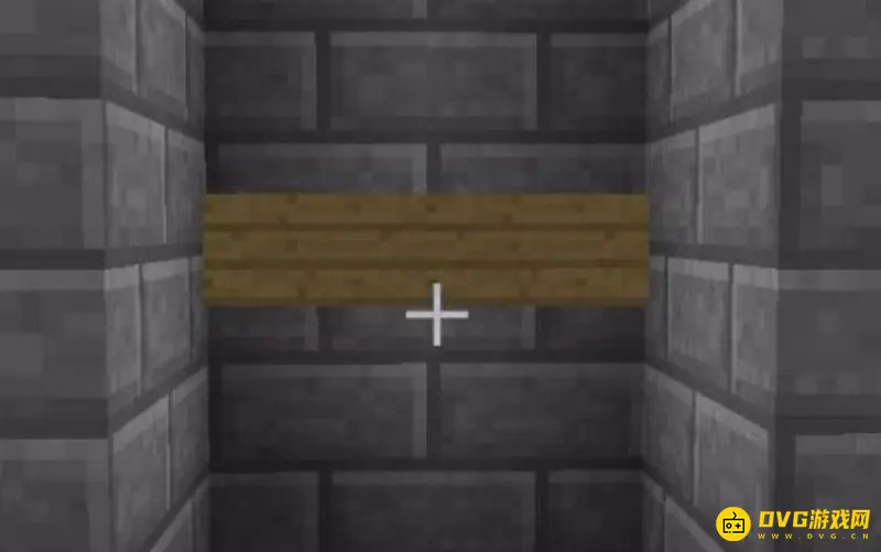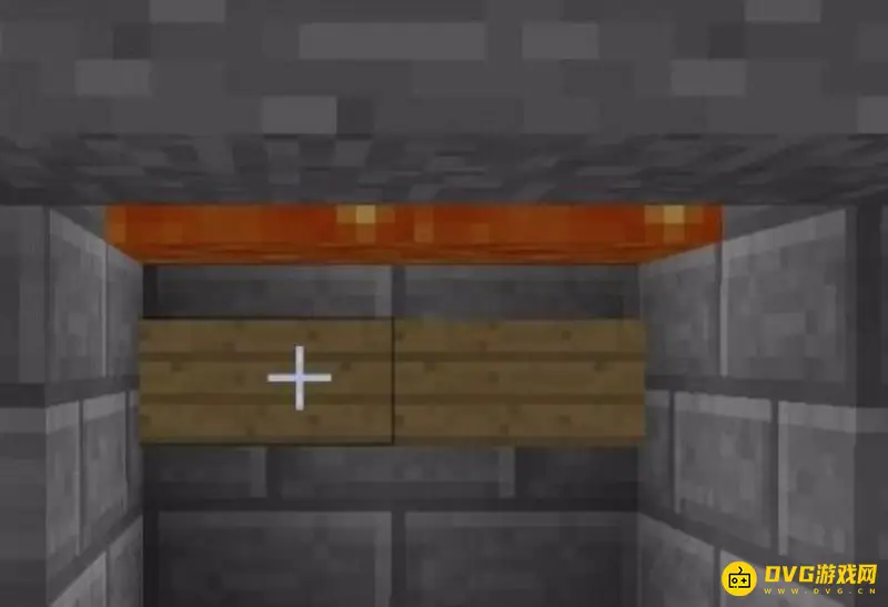 9、然后我们来到下面,在第二格高的地方贴2个木牌。木牌冲着的对面提高一格高,放两个石头,并且里面贴2个木牌。在木牌上面放一桶岩浆。岩浆会固定在那格。不会流下来,被木牌挡住了。