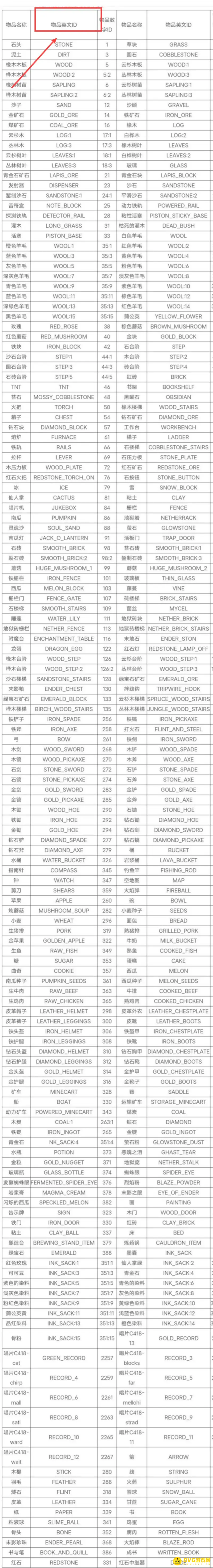 石头 STONE 1 草块 GRASS 2,泥土 DIRT 3 圆石 COBBLESTONE 4,橡木木板 WOOD 5 云杉木板 WOOD:1 5:1,桦木木板 WOOD:2 5:2 丛林木板 WOOD:3 5:3,橡树树苗 SAPLING 6 云杉树苗 SAPLING:1 6:1,桦木树苗 SAPLING:2 6:2 丛林树苗 SAPLING:3 6:3,沙子 SAND 12 沙硕 GRAVEL 13,具体如图所示: