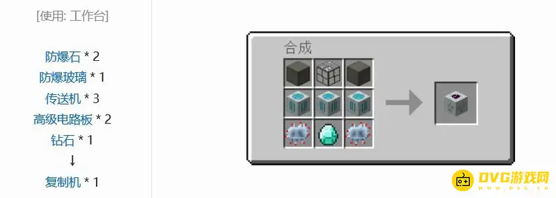 制作复制机,我们需要使用两个防爆石,一个防爆玻璃,三个传送机,两个高级电路板和一颗钻石,在工作台处就可以合成出复制机了。防爆石可以用石头和高级合金进行制作,钻石挖矿就可以得到,其他的部件也都是在工作台处就可以进行合成得到的。