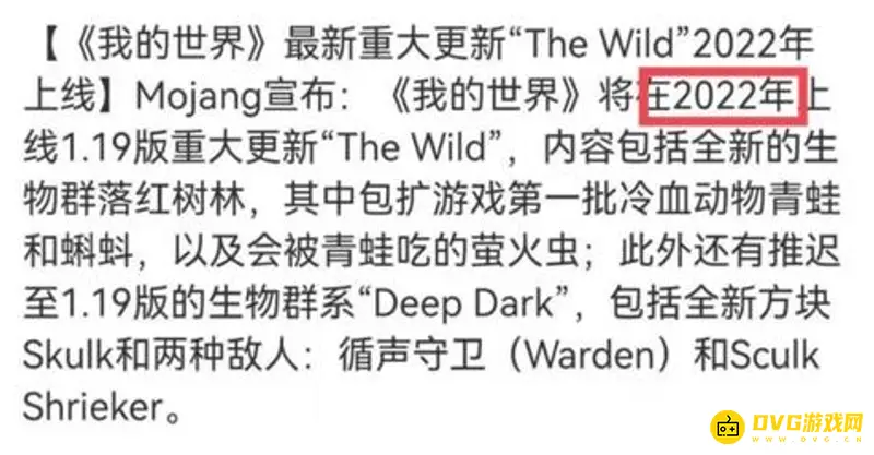 《我的世界》开发商Mojang 宣布《我的世界》1.19版本“荒野更新”将在2022年6月7号免费推出,登陆Xbox、PS、Switch、iOS、安卓、Windows、macOS和Linux等平台。玩家期待已久的新生物、新生态区即将到来。荒野更新将添加两个大型生态区:地下区域“深暗之域”和地上区域“红树林沼泽”。
