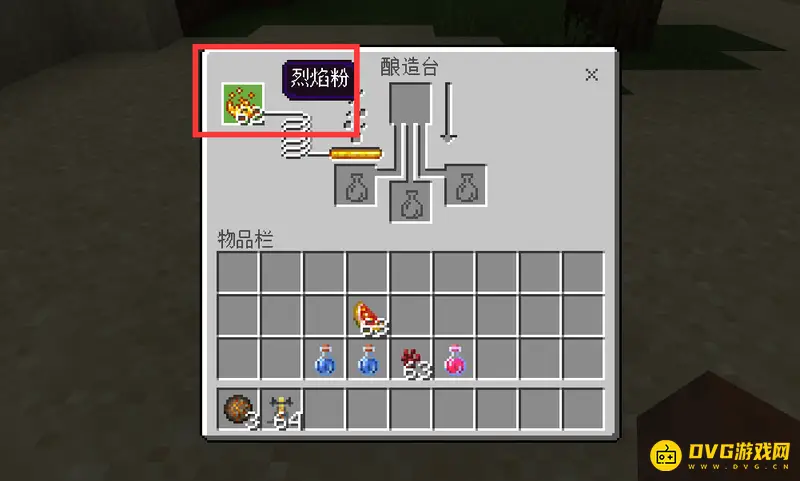 2、将烈焰粉放入酿造台左上角的格子里。