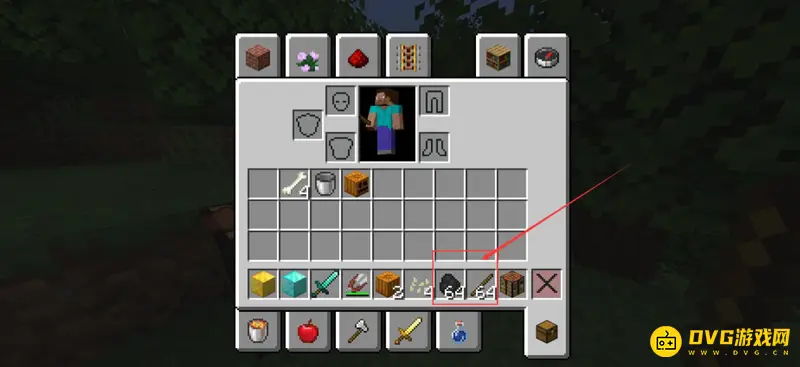 2.在工作台内将煤炭和木棍从上到下排列,每一个木棍加一个煤炭可以获得4个火把,如图所示。
