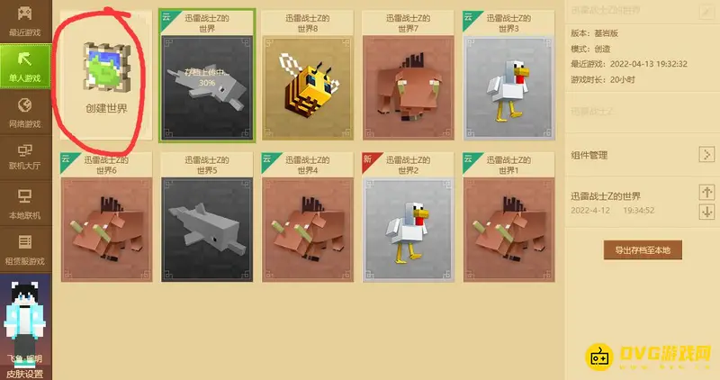 1,首先我们进入创建游戏界面,点击左侧的单人游戏,再点击右侧的创建世界。