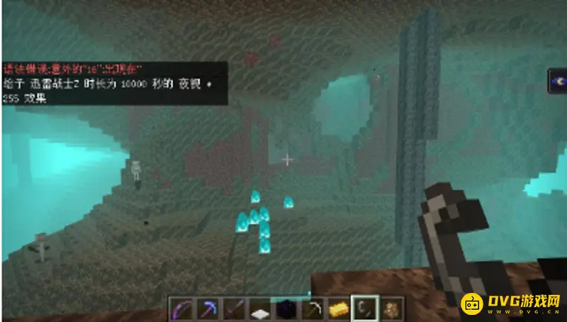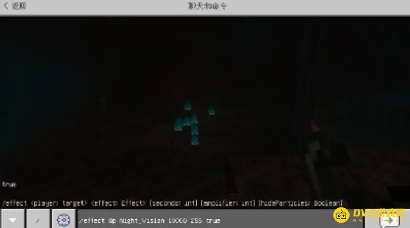 /effect @p Night_Vision 10000 255 true。effect表示给与玩家的状态。10000表示时间,只要时间足够长,就能无限夜视。255表示效果等级,255为最高等级。true表示喝完药水视角周边不会出现蓝色漩涡颗粒。夜视的作用是增加玩家在黑暗中的视野。如下图所示。