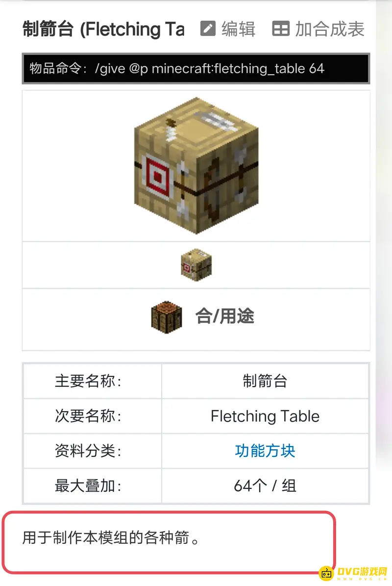 用于制作游戏里的各种箭。是制箭师村民的工作站点方块。如果一个制箭台没有被村民认领,则附近的任意一个失业村民有机会转变职业为制箭师。