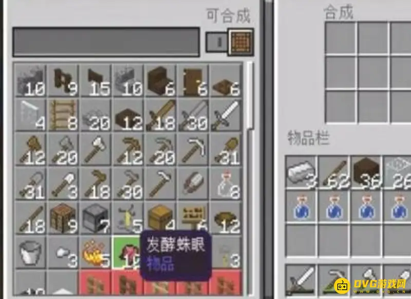 2、然后我们合成十个“蛛眼”——需要“蛛眼、灰蘑菇和糖。蜘蛛——我们可以通过打蜘蛛来获得;糖——用甘蔗来合成;蘑菇——在矿洞中有几率生成,或者从蘑菇岛、深色橡木林中获得。