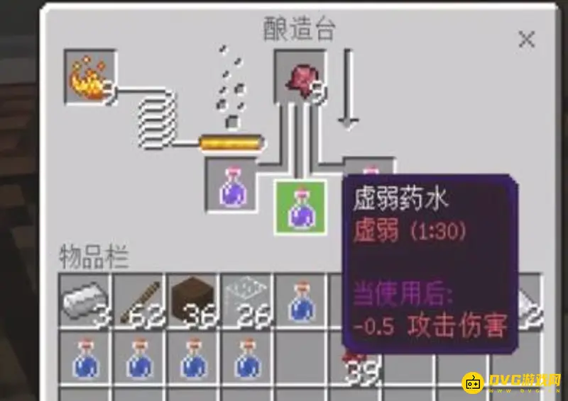 7、过几秒钟后,粗制药水就酿好了,我们再放上发酵蛛眼,虚弱药水就酿造好了。,等待药水酿造完毕,药水的有效时间从一分三十秒变成了4分钟。如果直接喝掉那么我们自己就会被虚弱了。所以要把药水变成喷溅型的,才能有效使用。