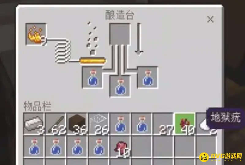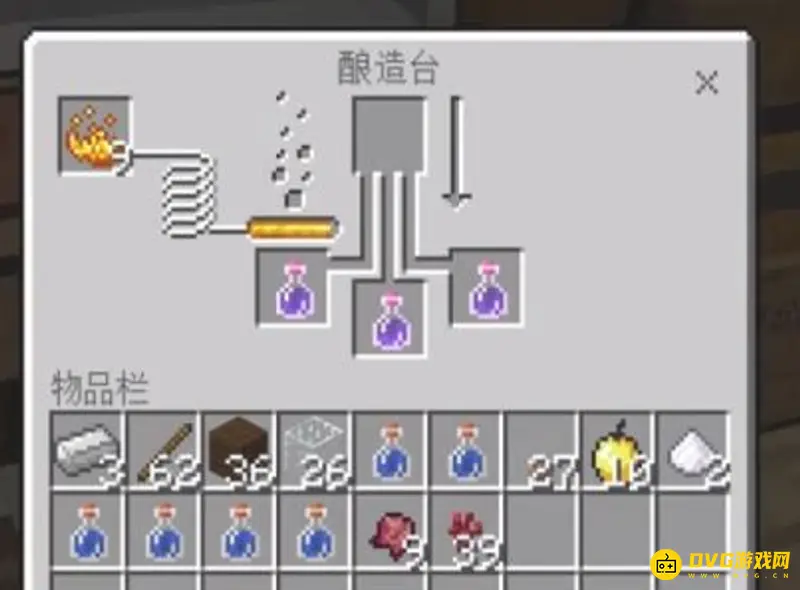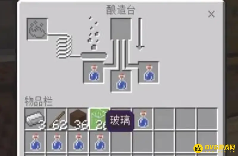 8、这时我们再向酿好了虚弱药水的酿造台放入火药,过几秒后,喷溅型虚弱药水就合成了,瓶子的形状也发生了变化。当我们朝对方使用喷溅型虚弱药水时要隔开一定的距离,不然我们也会被虚弱。