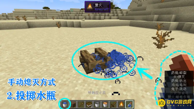 2.使用投掷水瓶,拥有和水桶一样的效果!对着营火直接“当头”扔上去,可以使其熄灭!投掷水瓶和水桶两者最大的不同在于,水桶有持续性,使用后会周围内都蔓延水,而水瓶则是一次性,扔完就没了。但两者在“水”方面的作用机理类似,所以对大多数物品的效果也相同。