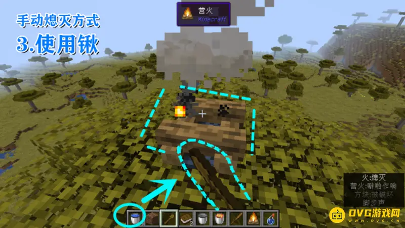 3.除了用水,用工具也能扑灭,嗯,这很科学!使用锹能扑灭营火,包括但不限于木锹、石锹、铁锹...不要问大黑为什么锹能灭火,用剑用镐就不行,大黑本来不知作何解释,但转念一想,兴许开发者的意思是,用锹可以铲泥上去,这样不就能把火压灭了吗,哈哈,这很科学。