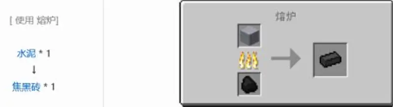 3.水泥制作完成后。依旧在熔炉中进行炼制就可以了,需要将水泥放在上面的格子中,下面的格子放入木炭或者煤矿,只需要一会焦黑砖就可以制作完成了。