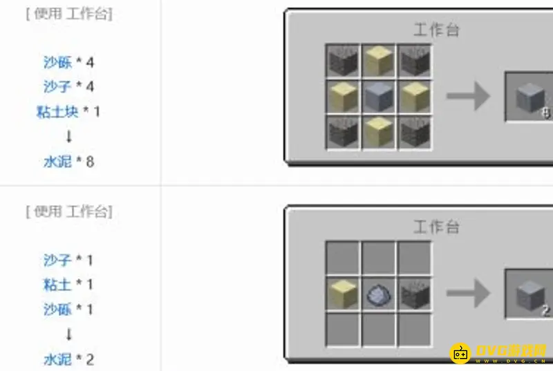 2.有了熔炉后,需要利用工具台制作水泥,水泥需要使用四块沙子、四块砂砾、以及一块黏土矿制作。或者一块砂砾、一块沙子、一个黏土也可以制作,这些材料都可以在野外获得。