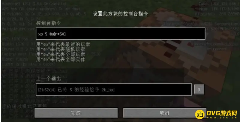 3.设置命令方块指令:xp 5是每运行一次给你的经验,这是5就是每次给你5点,r=50就是50格有效范围。