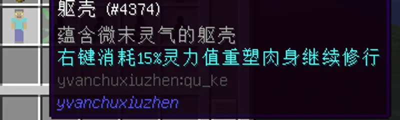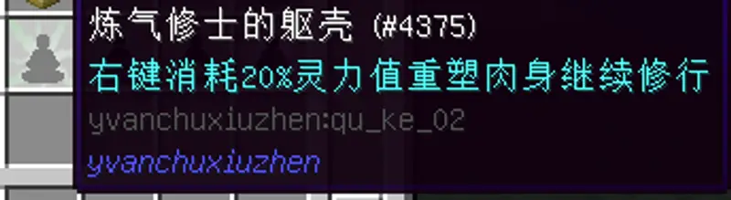 3、练气境界死亡后会元神出窍,元神出窍会增加65%-75%的速度,但是元神出窍力量为原来的20%,元婴出窍是50%,躯壳由僵尸,僵尸猪人,村民,散修,魔修掉落,练气需使用躯壳恢复,恢复消耗15%的灵力,筑基需使用练气修士的躯壳,消耗20%的灵力,灵力不足无法恢复,躯体10秒就会自然消失。修炼时无法使用躯壳,同时无法突破境界,筑基后元神出窍需要低一个大境界的躯壳(如筑基期需要练气期的躯壳)。(躯壳可以使用箱子等容器储存)