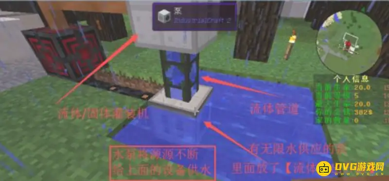 3、给【流体/固体灌装机】通电,并且让【泵】给【流体/固体灌装机】左侧水槽灌水!