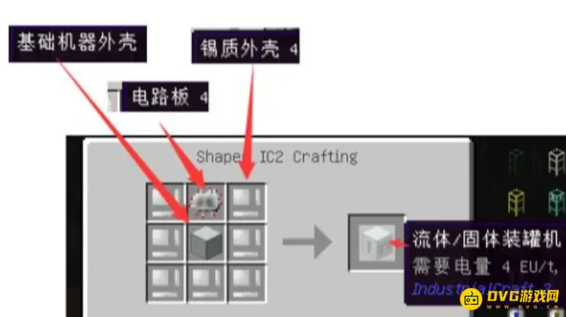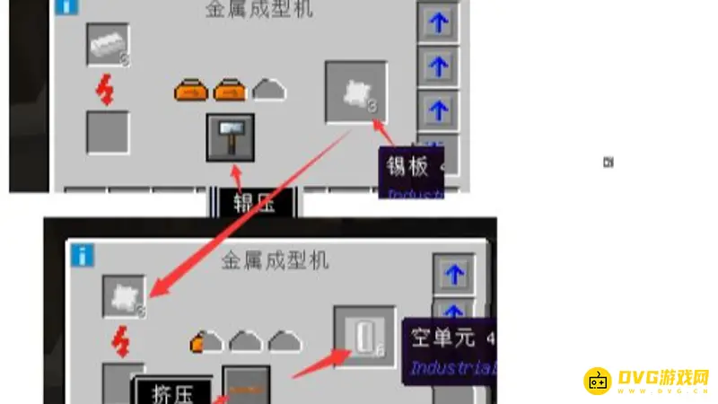 2、合成空单元,使用【金属成型机】或者【锻造锤】把锡锭锤成【锡板】,再让锡板在 【金属成型机】上通过【挤压】得到【空单元】