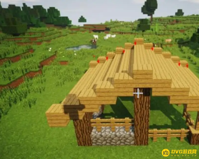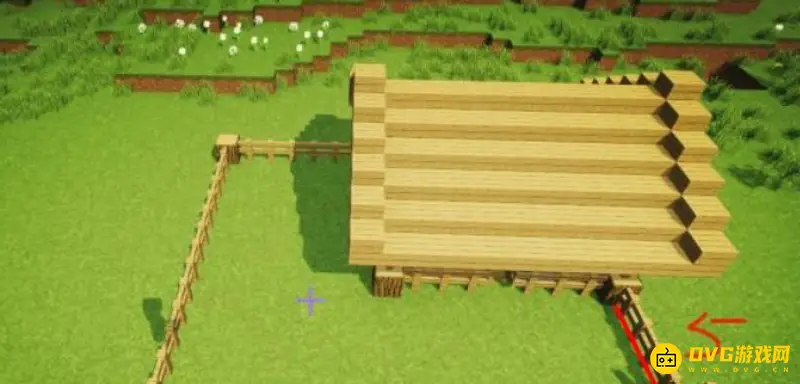 5、开始建造外围栅栏,我们从棚子最右边开始搭建,用5根橡木栅栏连接起来,在末端放置好橡木树桩。