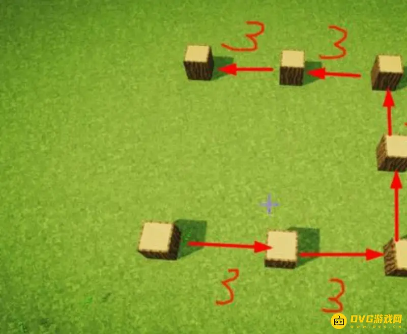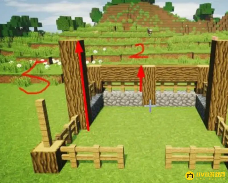 1、用橡木桩搭建一个地基,这个地基按照图中样式建造一个反过来的"C"字形。每隔3个空格建造一个橡木木桩。