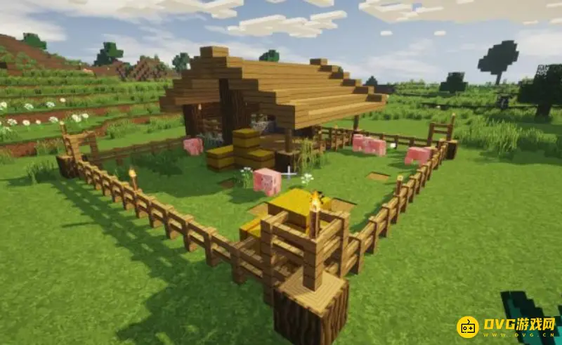 6、开始制作装饰了,我们在棚子旁边放置一堆草垛,在栅栏死角也可以制作一堆,再把地面放置一些野生的植物,在栅栏上面放置火把。