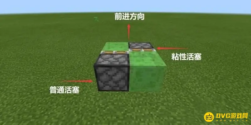 1、首先我们先按照下图,在离地面一格的位置,利用粘性活塞和普通活塞,摆放好前进装置的基础