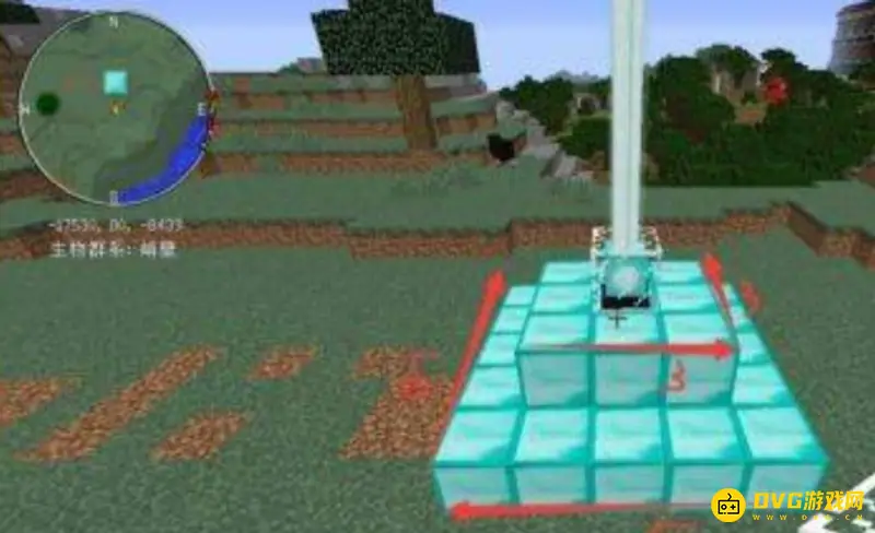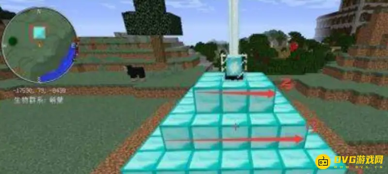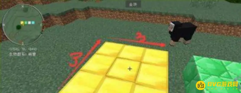 一、将金块、铁块、钻石块、绿宝石块中的一种摆成3×3的基座,将信标放置在方块的中心,如下图所示;