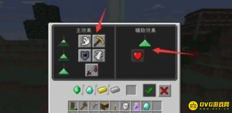四、用鼠标右键点击信标,将矿石放到格子中,点击左边的主效果,再点下面的绿色√就能激活信标,如下图所示。