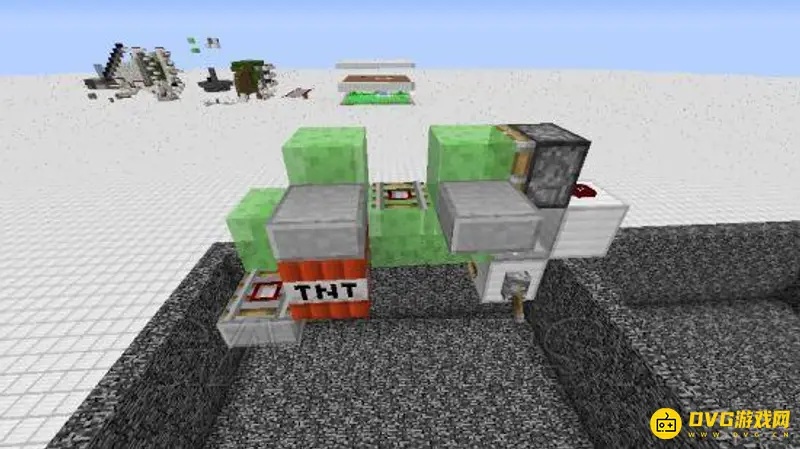 4.然后我们再放两个探测铁轨,在半砖下面放一个TNT。