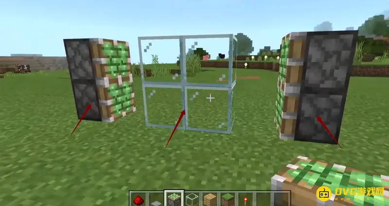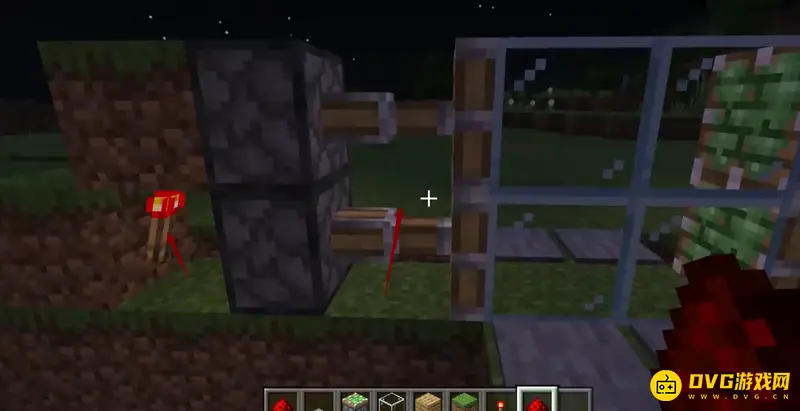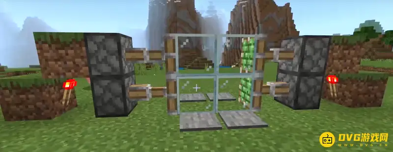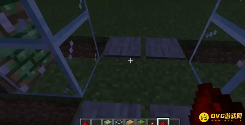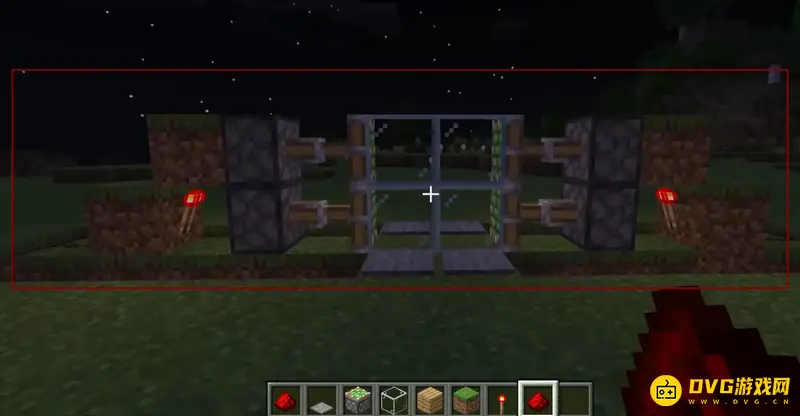 3、然后逐步放上草方块、石质压力板和红石火把,如下图所示