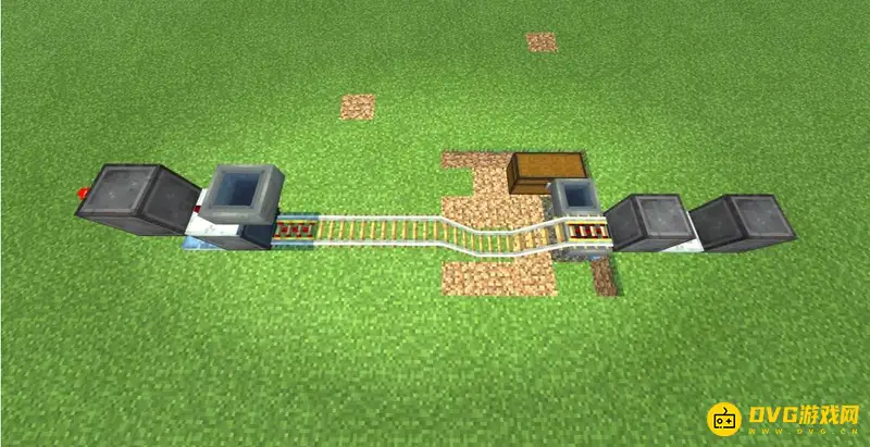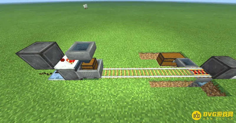 1、接下来来讲解一下全自动运输装置的使用方法。当发车装置的漏斗中还有物品的时候,运输矿车就会停下收集物品。等待收集完成后,就会发车前往停站装置。然后停站装置的漏斗,将物品转移到最终的存储箱子中,实现全自动运输循环。