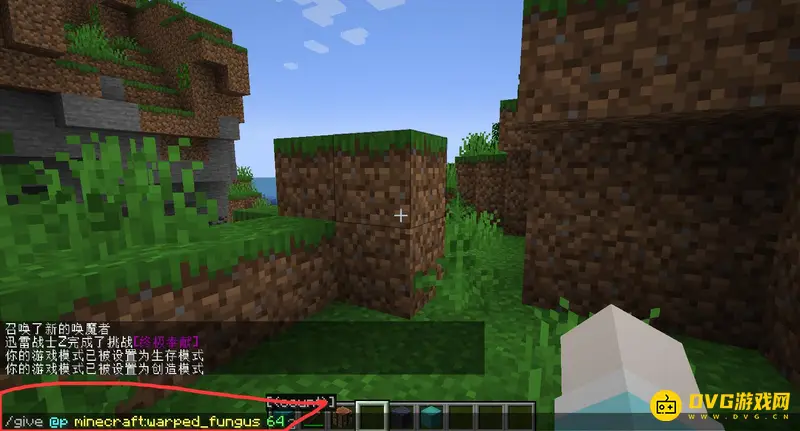1,例如我们可以打开聊天框,输入指令/give @p minecraft:warped_fungus 64。