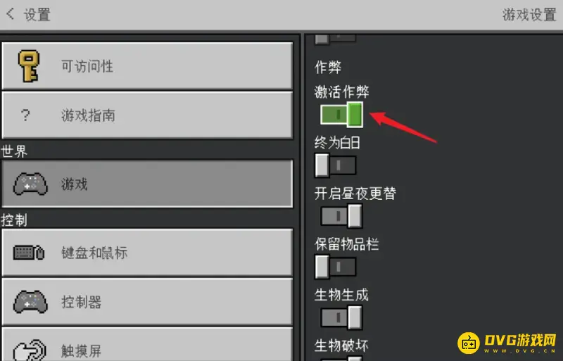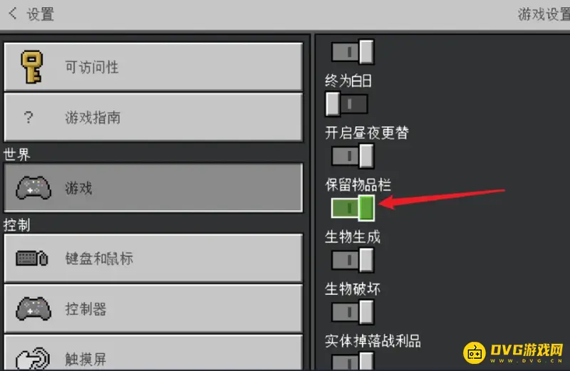 5、将保留物品栏的开关打开,开启死亡不掉落功能。